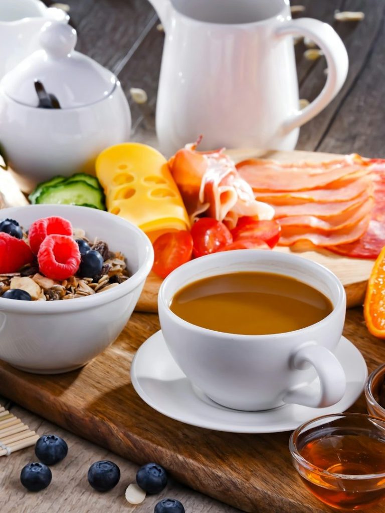Ein reichhaltiges Frühstücksbuffet bietet eine verlockende Auswahl an Brötchen, die frisch und knusprig aus dem Ofen kommen. Dazu passt hervorragend eine Tasse aromatischer Kaffee oder eine erfrischende Auswahl an Säften, um den Tag munter zu beginnen. Eierspeisen, wie Rührei oder Spiegelei, runden das Angebot perfekt ab. Für Liebhaber von Milchprodukten gibt es Joghurt und Quark in verschiedenen Geschmacksrichtungen. Ein zartes Croissant sorgt für einen Hauch französischer Eleganz, während frisches Obst eine gesunde und leckere Ergänzung darstellt. Vielfältige Marmeladen stehen bereit, um den Brötchen das gewisse Etwas zu verleihen, und machen das Frühstück zu einem genussvollen Erlebnis.